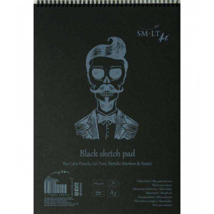 30 lapas. 165g/m². Melns, gluds papīrs. Stingrs aizmugurējais vāks, ar spirāli un mikroperforāciju lapu izplēšanai. Piemērots zīmuļiem, gēla pildspalvām, marķieriem un pasteļiem...