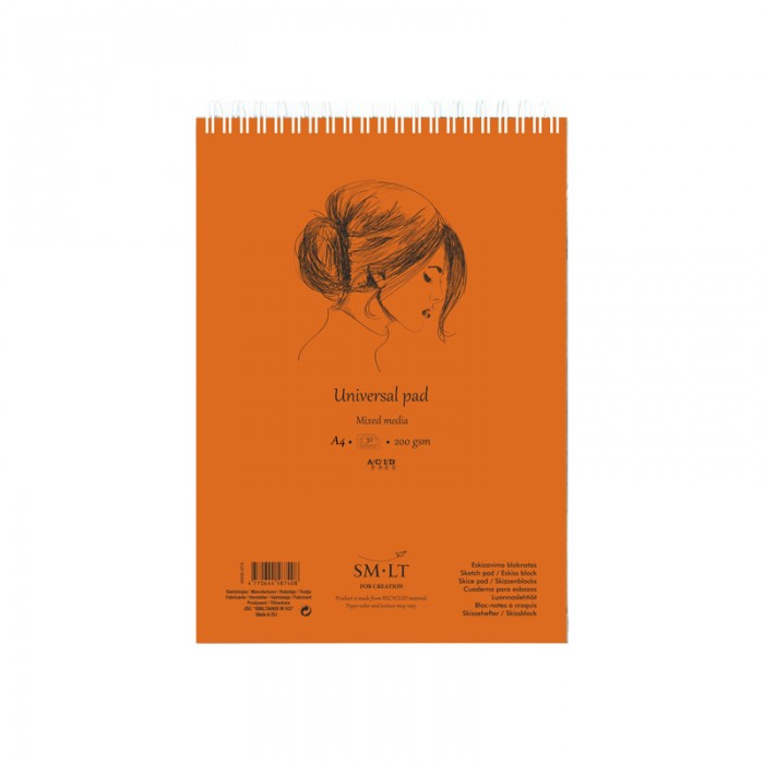 SMLT ''Universal pad'' skiču blociņš ar spirāli jauktai tehnikai. A5 izmērs, 40 lapas, papīra biezums ir 200 g/m2. Skicēšanai ar grafīta zīmuļiem, pildspalvu, oglēm un akvareļu krāsām. ..